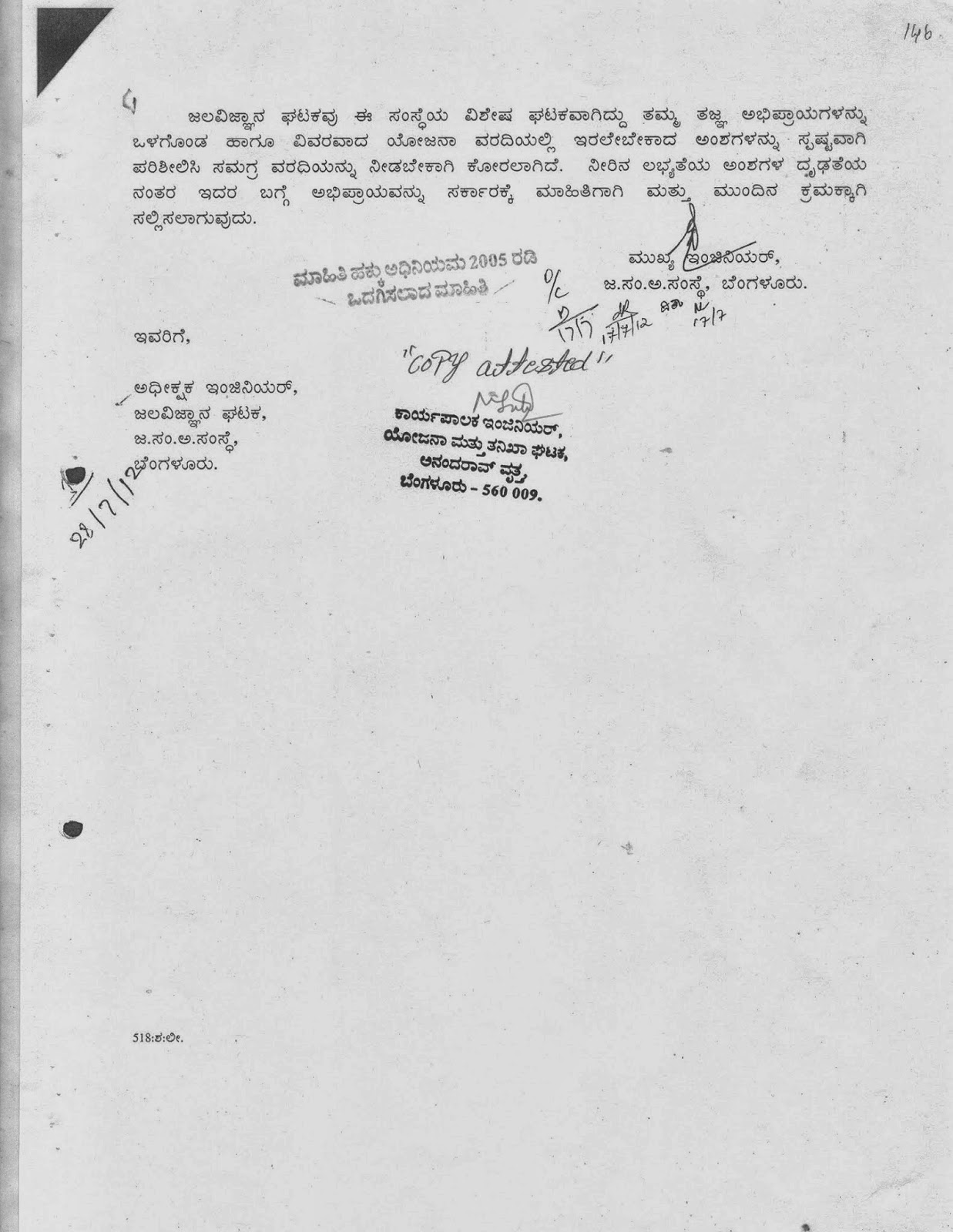 ಜಲಸಂಪನ್ಮೂಲ ಇಲಾಖೆಯ ಜಾಲತಾಣದಲ್ಲಿ ಮಾಹಿತಿ ಹಕ್ಕಿನ ಅಡಿ ಕೆಲವು ವಿವರಗಳನ್ನು ಕೊಡಲಾಗಿದೆ. http://waterresources.kar.nic.in/File0001.PDF ಎಂಬ ಫೈಲಿನ ಏಳನೇ ಪುಟದಲ್ಲಿ “ಕರ್ನಾಟಕ ಜಲಸಂಪನ್ಮೂಲ ಪ್ರಾಧಿಕಾರ” ಎಂಬ ಸಂಸ್ಥೆಯೊಂದರ ವಿವರಗಳಿವೆ. ಈ ಸಂಸ್ಥೆಯ ಉದ್ದೇಶ ಇತ್ಯಾದಿಗಳು ಅದರಲ್ಲಿ ಇಲ್ಲ. ಆದರೆ ಆಶ್ಚರ್ಯಕರವೆನ್ನುವಂತೆ ಈ ಸಂಸ್ಥೆಯ ಸದಸ್ಯರ ಪಟ್ಟಿಯಲ್ಲಿ ಶ್ರೀ ಪಡ್ರೆ, ಶ್ರೀಮತಿ ರೋಹಿಣಿ ನಿಲೇಕಣಿ ಮುಂತಾದ ಹೆಸರುಗಳಿವೆ. ಹಾಗಿದ್ದರೆ ಸರಕಾರಕ್ಕೆ ನೀರಿನ ಕ್ಷೇತ್ರದಲ್ಲಿ ಯಾರು ಕೆಲಸ ಮಾಡಿದ್ದಾರೆ, ಮಾಡುತ್ತಿದ್ದಾರೆ ಎನ್ನುವುದು ತಿಳಿದಿದೆ ಎಂದಂತಾಯಿತು. ಬಯಲುಸೀಮೆಯ ನೀರಿನ ಸಮಸ್ಯೆಯ ಪರಿಹಾರಕ್ಕೆ, ಸ್ವಂತಕ್ಕೆ ಯಾವ ಲಾಭವೂ ಇಲ್ಲದೆ ಕೇವಲ ದೇಶದ ಹಿತದೃಷ್ಟಿಯನ್ನೇ ಗಮನದಲ್ಲಿಟ್ಟುಕೊಂಡು ಕೆಲಸ ಮಾಡಿರುವ ಇಂಥವರ ಮತ್ತು ಇವರು ಸೂಚಿಸಬಹುದಾದ ಇತರರ ಸಲಹೆಗಳನ್ನು ಸರಕಾರ ಪಡೆದರೆ, ಈ ಸಮಸ್ಯೆಗೆ ಖಂಡಿತ ಪರಿಹಾರ ಸಿಕ್ಕುತ್ತದೆ.